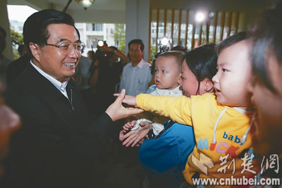 “胡爺爺好!”在武漢綠景苑節(jié)能小區(qū),小朋友們向胡錦濤總書記問好。