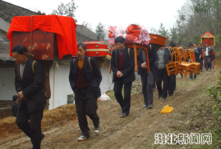 今年1月,該縣文化部門在采花鄉(xiāng)找到完整的“唐祭儀式”藝人班子。十幾名藝人雖然在解放后都沒有再進行過“告祖”儀式,但整個程序記得十分清楚。經(jīng)協(xié)商策劃,決定利用男女雙方實景把“告祖”及土家婚俗完整真實拍攝下來。3月28日,市縣兩級文化工作專班和十六名民間藝人開赴傅家堰火山村,日夜奮戰(zhàn)4天,終于把“告祖”的整個程序以寫實手法拍攝下來。同時,還拍攝到了土家婚俗中背新娘、吃雞蛋茶、抬花轎、陪十弟兄、陪十姊妹的珍貴鏡頭,把土家婚俗完整記錄了下來,為項目的申報工作進一步夯實了基礎。