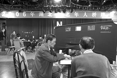 荊楚網(wǎng)消息(湖北日?qǐng)?bào))(通訊員洪海)由省橋牌協(xié)會(huì)主辦的2006年全省老年人橋牌賽昨日起在漢舉行。共有來(lái)自全省各地的22支老年人橋牌隊(duì)參加了角逐。比賽將進(jìn)行四天時(shí)間,每天進(jìn)行5輪比賽,每輪為10副牌。參賽者中年齡最大的達(dá)84歲。