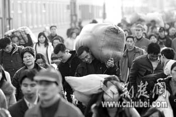 連日來(lái),武昌火車(chē)站,滾滾旅客流中,背著大包小包的返鄉(xiāng)農(nóng)民工明顯增多了(上圖)。一年辛勞,收獲頗豐,農(nóng)民工露出了開(kāi)心的笑容(下圖)。記者采訪得知,他們提前返鄉(xiāng),一方面是想避開(kāi)春運(yùn)高峰,同時(shí)也想多一些和家人團(tuán)聚的時(shí)間。(記者張磊田悅攝)