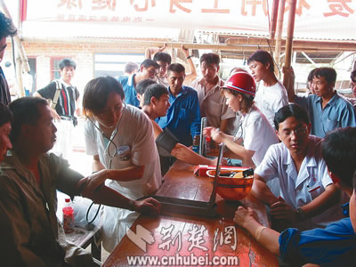 15日,參加武鋼工程建設的百余位農(nóng)民工兄弟,樂呵呵地接受了中國一冶電裝公司武鋼項目部為他們免費進行的體檢。浠水工程隊民工朱宗杰說:“這兩年來,社會各界對農(nóng)民工的關(guān)心很實在。”
