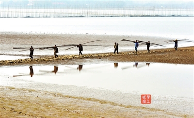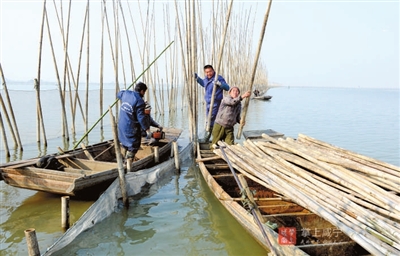 一旁,駕駛著機(jī)船的漁民們,或忙著收網(wǎng),或配合將割下的竹子運(yùn)回岸邊。船只在湖面上留下道道漣漪,灘涂上抗著竹子的漁民蜿蜒成一幅畫。