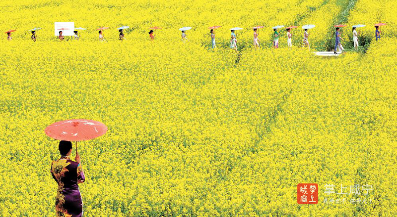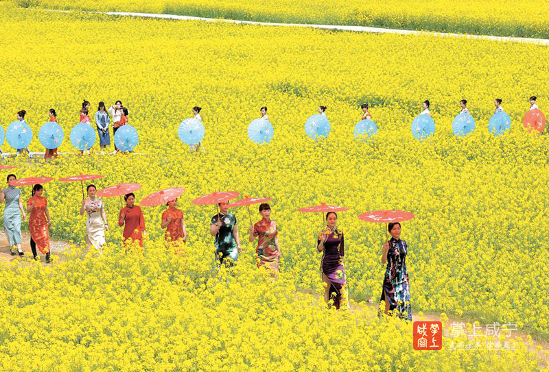 26日,咸安區(qū)馬橋建國畈油菜花基地,80多位旗袍佳麗在田間秀“T臺”。