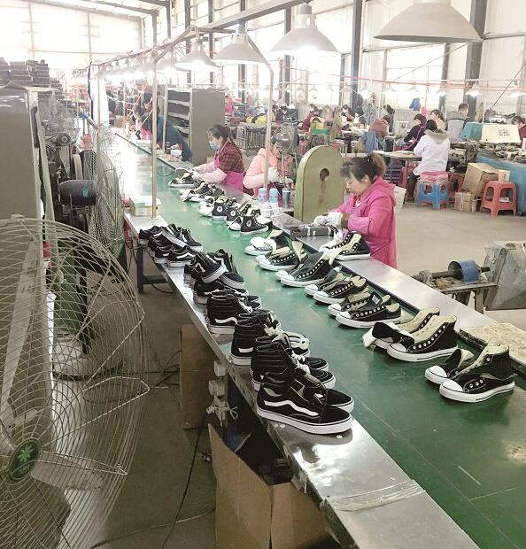生產(chǎn)車(chē)間面積上千平方米,里面氣味刺鼻,數(shù)臺(tái)電風(fēng)扇正呼呼轉(zhuǎn)動(dòng),100多名工人十分忙碌:制作鞋底、印花、縫制鞋面、做鞋幫、固定鞋型、系鞋帶、裝盒……