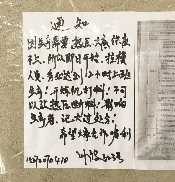 執(zhí)法人員查處時(shí),工人們并不驚慌,部分工人甚至繼續(xù)趕工。墻上張貼的通知寫(xiě)著:“因生產(chǎn)需要……拉模人員務(wù)必達(dá)到12小時(shí)上班生產(chǎn)?!睆S方一負(fù)責(zé)人辯稱(chēng):這里不是在造假,而是讓工人練手藝。
