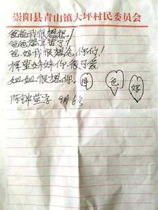 據(jù)陳師傅介紹,他們老家是青山鎮(zhèn)人,現(xiàn)在住在縣城。大孫女錦瑩今年5歲,爸媽帶著十個(gè)月大的妹妹梓瑩在浙江務(wù)工,每隔半年才能抽空回來(lái)看她。6日,聽(tīng)說(shuō)與爸媽一起做事的舅爺要回浙江,錦瑩就說(shuō)要給爸媽寫封信??墒撬艅偵嫌變簣@,字寫得不好,就央求奶奶握著她的手,一筆一筆寫了這封信,并看著爺爺將信裝在箱子里才放心。哪知舅爺在轉(zhuǎn)車途中不慎將包裹遺失了,錦瑩聽(tīng)說(shuō)后還哭了鼻子的。