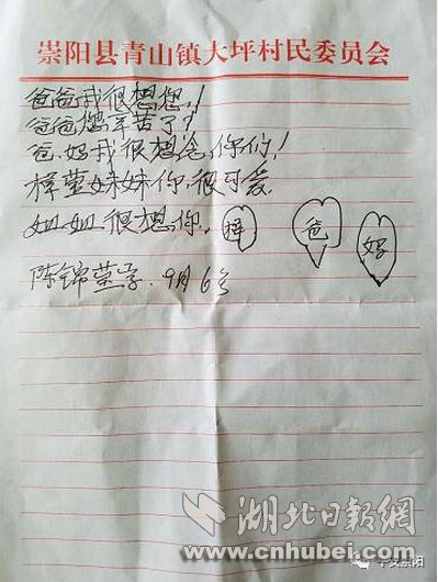 薄薄的信紙上筆跡稚嫩,一筆一劃卻還工整,落款為“陳錦瑩字,9月6號(hào)”,在信紙上還用畫了三顆心,里面分別寫著“梓”、“爸”、“媽”。