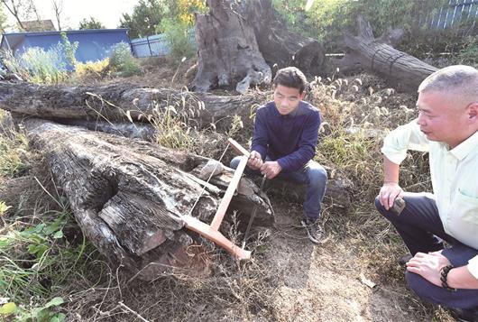 專家現(xiàn)場檢查木頭的橫切面