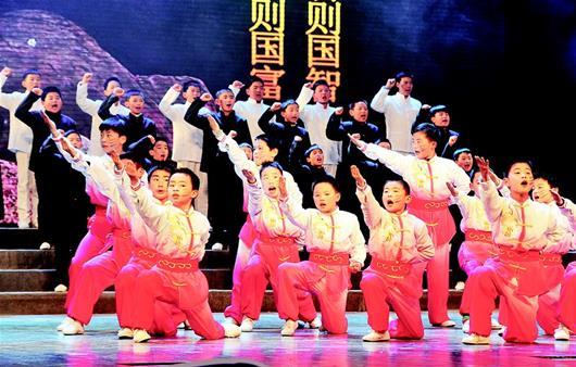 “野無遺賢,萬邦咸寧;首出庶物,萬國咸寧……”12月19日,由省委宣傳部、省教育廳、省廣播電視臺聯(lián)合主辦的“同聲誦經(jīng)典——2017湖北省‘起點閱讀·朝讀經(jīng)典’校園巡回展演活動”走進咸寧。當(dāng)天下午,在咸寧市會議中心,稚嫩的童聲、整齊的朗誦,配舞臺水墨畫的背景,讓在場的近千名中小學(xué)生如入詩畫之境?!斑筮髲?fù)唧唧,木蘭當(dāng)戶織。不聞機杼聲,唯聞女嘆息……”一首《木蘭詩》讓觀眾們猶如置身于北朝的烽煙中,青年花木蘭敢于擔(dān)當(dāng)?shù)木褡屓司磁?,值得?dāng)代青少年學(xué)習(xí)借鑒。