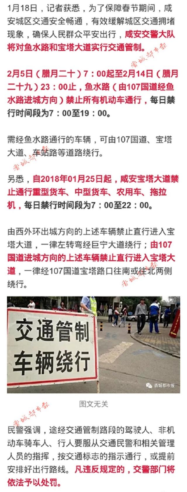 18日悉,為保障春節(jié)期間,咸安城區(qū)交通安全暢通,咸安交警大隊將對魚水路和寶塔大道實行交通管制。途經(jīng)交通管制路段的駕駛人、行人要服從交通民警和相關管理人員的指揮,按交通標志的指示通行。凡違反規(guī)定的,將依法處罰。具體路段