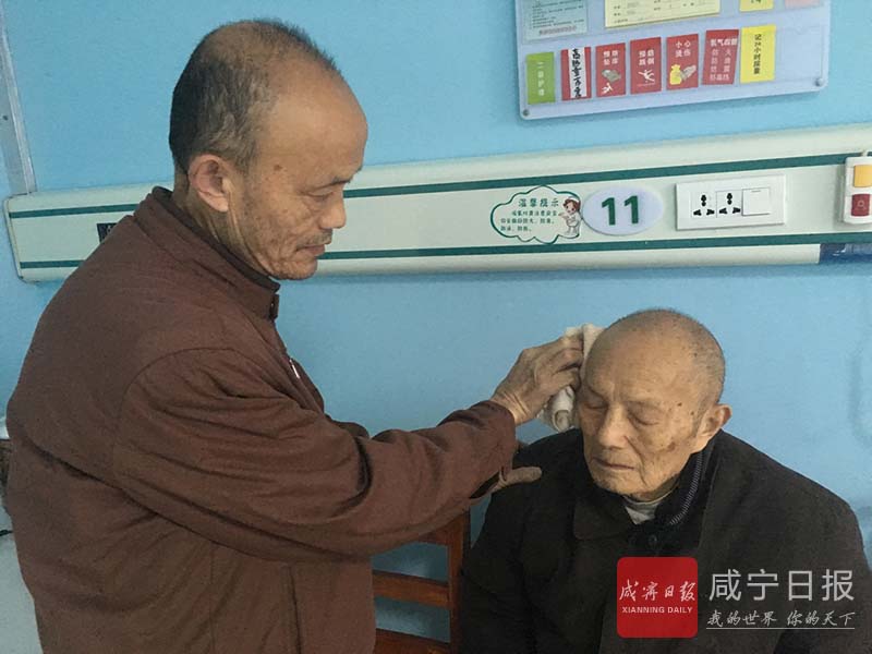 在咸寧市中醫(yī)醫(yī)院老年病科的走廊,常常會(huì)見到一位身材清瘦的老人推著輪椅,輪椅上坐著一位頭發(fā)花白的老者。老人時(shí)而給老者蓋好搭在腿上的薄被,時(shí)而給他擦擦嘴角的口水,時(shí)而給他講講有趣的事情……