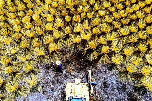 6月25日,咸寧市咸安區(qū)汀泗橋鎮(zhèn)赤崗村鑫源竹加工廠,工人們正在翻曬一捆捆長長的竹筷子,宛如一朵朵花開在曬場上。咸安區(qū)竹資源豐富,當地建成可再生的竹循環(huán)產業(yè),有上下游竹加工廠20多個,滿山翠竹成為當地農民的“致富竹”。