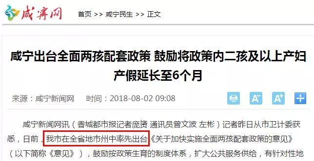 報(bào)道顯示,咸寧是湖北省率先出臺(tái)“全面兩孩配套政策”的地級(jí)市 。