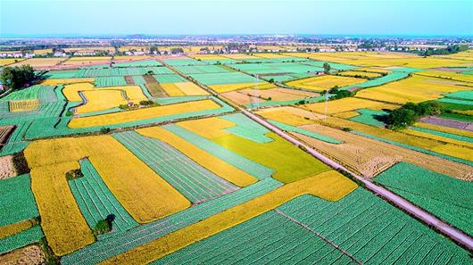10月11日,嘉魚縣潘家灣鎮(zhèn),大白菜、包菜、中稻、晚稻在田野上鋪開調色板,形成初秋時節(jié)長江南岸獨特的農業(yè)景觀。農業(yè)大縣嘉魚,蔬菜種植面積58萬多畝,水稻28萬多畝,正在創(chuàng)建全國現代農業(yè)示范區(qū)。