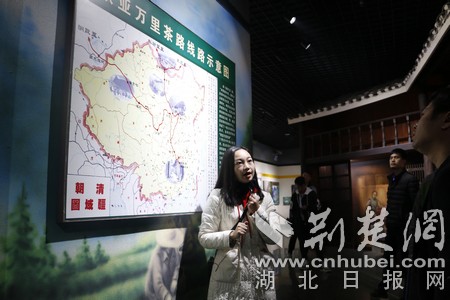 金牌講解員正在向采風(fēng)團(tuán)成員講解萬(wàn)里茶道路線。(采訪團(tuán)成員供圖)