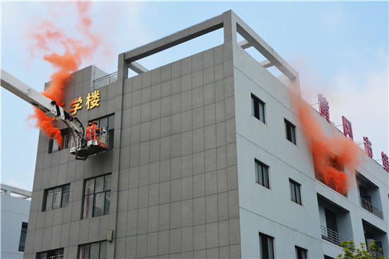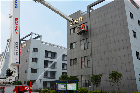 消防救援組指揮員臨時(shí)決定采用2臺(tái)舉高噴射消防車在教學(xué)樓外側(cè)內(nèi)攻滅火,在樓道處利用68米登高平臺(tái)消防車實(shí)施人員轉(zhuǎn)移。隨著登高平臺(tái)緩緩將至地面,被困4名師生成功獲救。