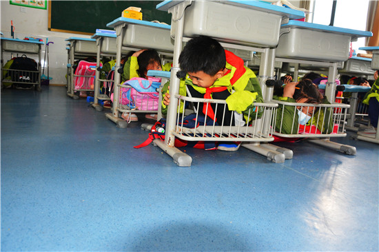 當(dāng)天上午9:30,隨著指揮長一聲令下,防空警報(bào)聲響徹校園,只見學(xué)生們?cè)诮淌已杆衮榍眢w,蹲伏在桌下,利用課桌有效進(jìn)行自護(hù),等待逃生信號(hào)。