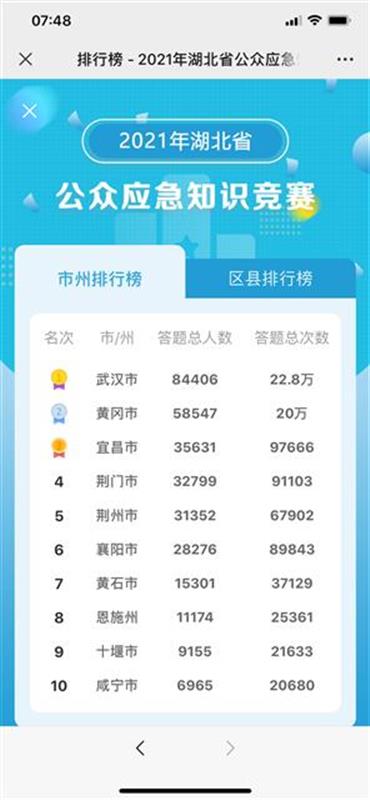 湖北省應(yīng)急知識競賽答題活動于5月8日正式開賽,截至當日17時,參與人數(shù)突破23.3萬人,答題總次數(shù)超62萬次。