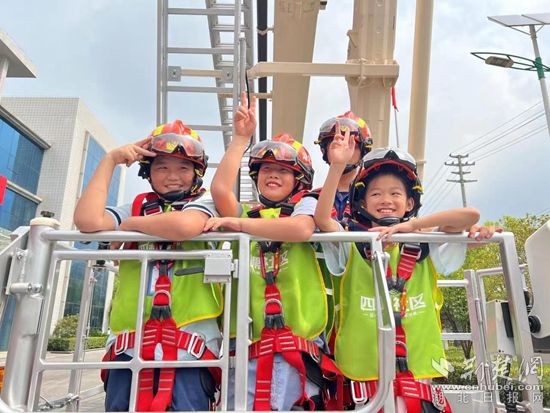 在體驗和互動環(huán)節(jié),孩子們觀看了消防員精彩的技能演示,穿上戰(zhàn)斗服,并乘上登高消防車體驗高處救援,孩子們不時發(fā)出陣陣歡呼聲,著實過足了“消防癮”。