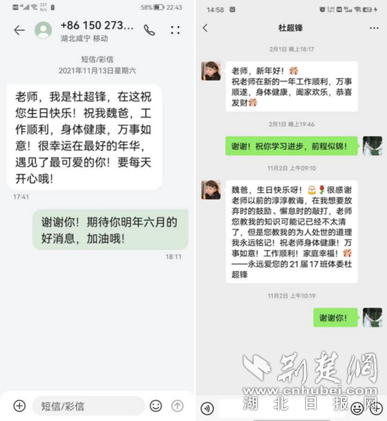 荊楚網(wǎng)(湖北日報網(wǎng))訊(記者黃錚)“魏爸,生日快樂呀!很感謝老師以前的諄諄教誨,在我想要放棄時的鼓勵、懈怠時的敲打……”11月2日,通城縣一中魏剛老師收到到了這樣一條微信消息。連續(xù)兩年,他都收到了2021屆學(xué)生杜超鋒發(fā)來的生日祝福短信。