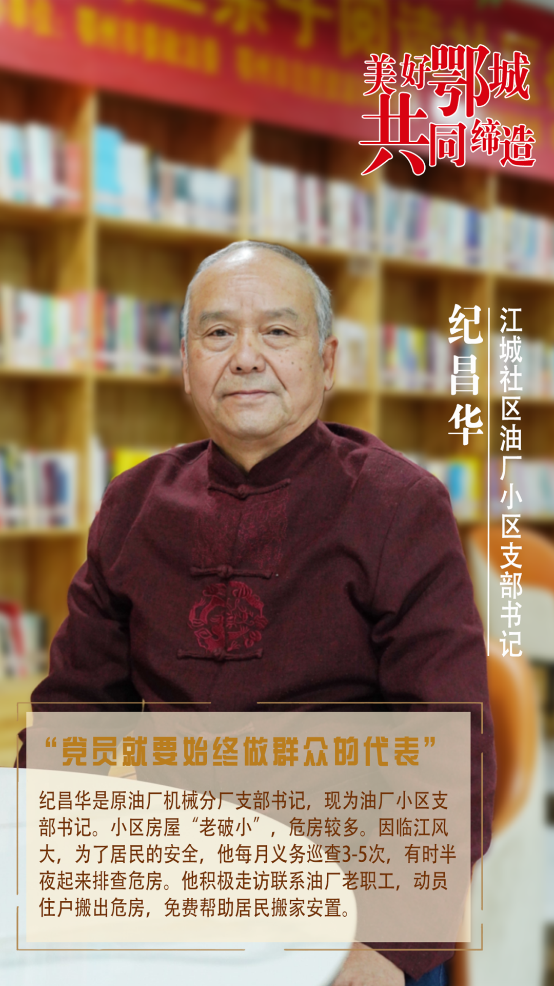紀(jì)昌華是原油廠機械分廠支部書記,現(xiàn)為油廠小區(qū)支部書記。小區(qū)房屋“老破小”,危房較多。因臨江風(fēng)大,為了居民的安全,他每月義務(wù)巡查3-5次,有時半夜起來排查危房。他積極走訪聯(lián)系油廠老職工,動員住戶搬出危房,免費幫助居民搬家安置。