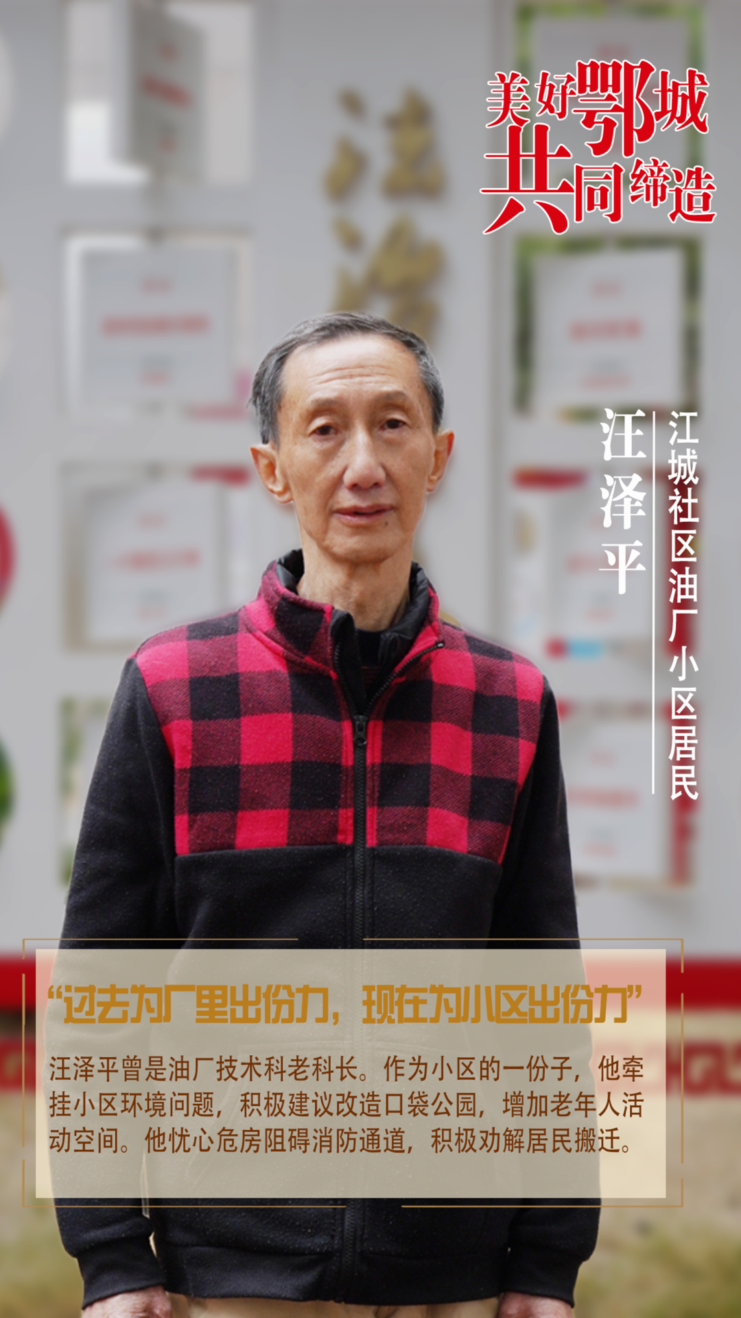 汪澤平曾是油廠技術(shù)科老科長。作為小區(qū)的一份子,他牽掛小區(qū)環(huán)境問題,積極建議改造口袋公園,增加老年人活動空間。他憂心危房阻礙消防通道,積極勸解居民搬遷。