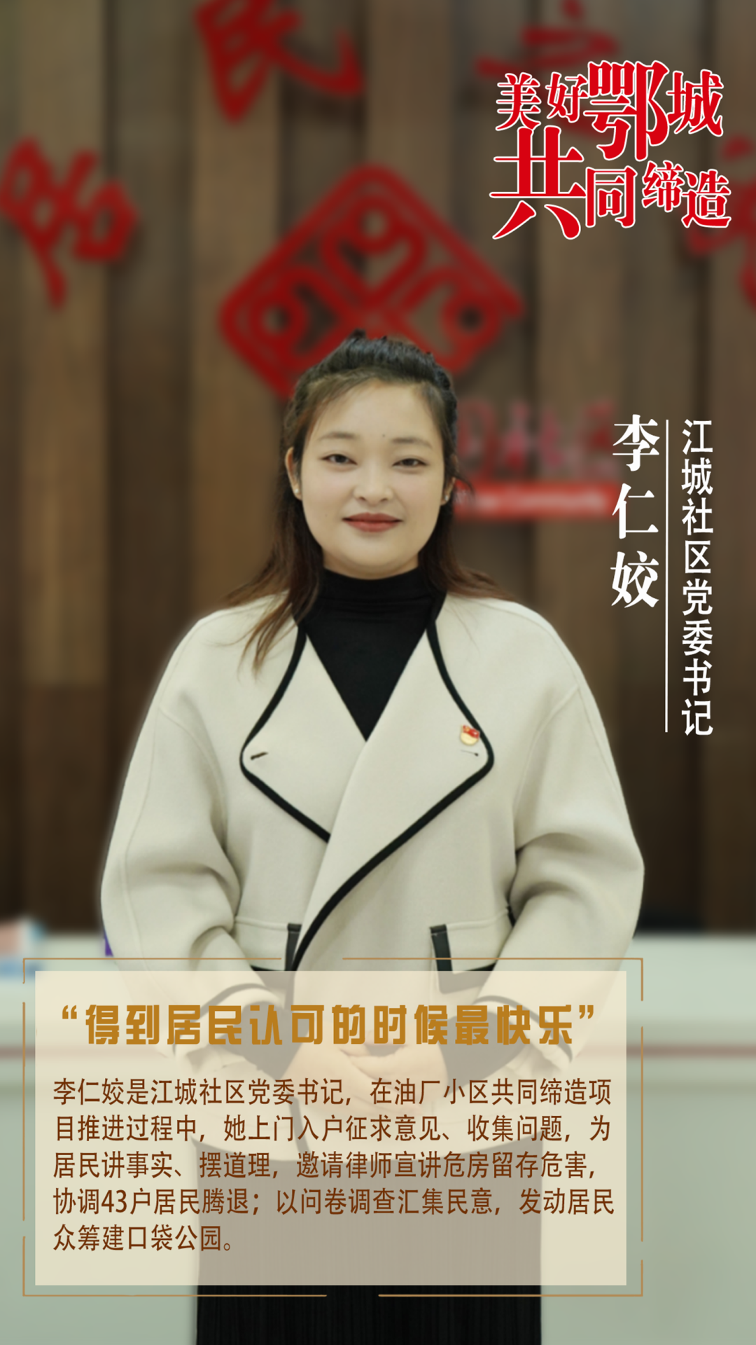 李仁姣是江城社區(qū)黨委書記,在油廠小區(qū)共同締造項目推進過程中,她上門入戶征求意見、收集問題,為居民講事實、擺道理,邀請律師宣講危房留存危害,協(xié)調(diào)43戶居民騰退;以問卷調(diào)查匯集民意,發(fā)動居民眾籌建口袋公園。