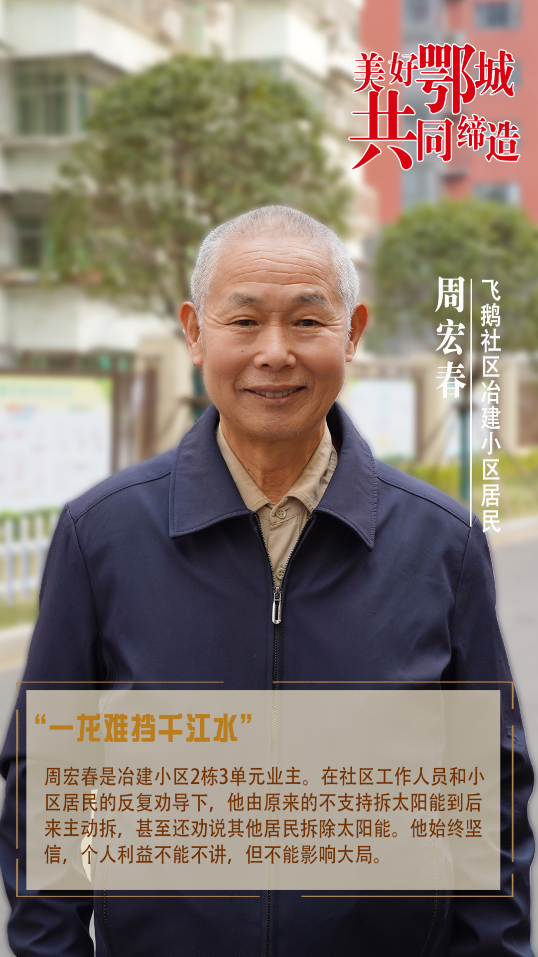 周宏春是冶建小區(qū)2棟3單元業(yè)主。在社區(qū)工作人員和小區(qū)居民的反復(fù)勸導(dǎo)下,他由原來的不支持拆太陽能到后來主動拆,甚至還勸說其他居民拆除太陽能。他始終堅信,個人利益不能不講,但不能影響大局。