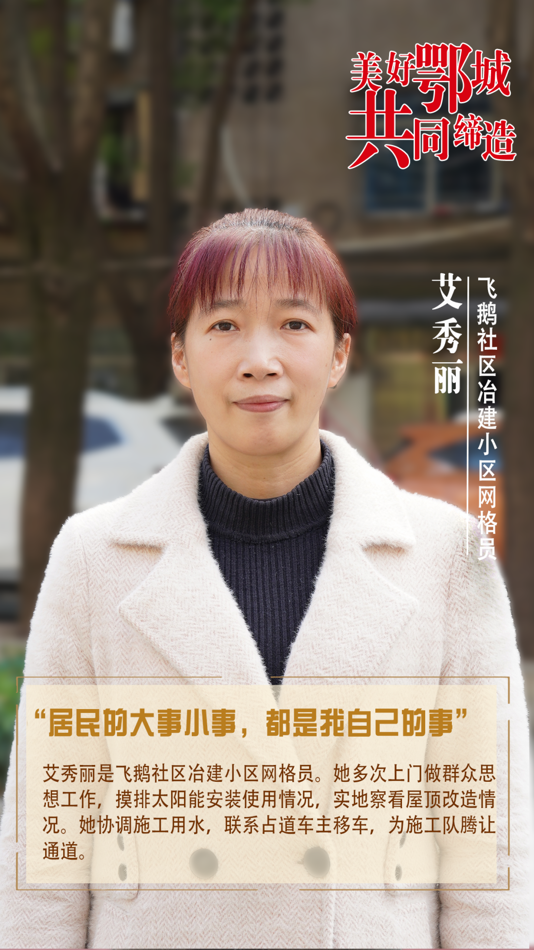 艾秀麗是飛鵝社區(qū)冶建小區(qū)網(wǎng)格員。她多次上門做群眾思想工作,摸排太陽能安裝使用情況,實地察看屋頂改造情況。她協(xié)調(diào)施工用水,聯(lián)系占道車主移車,為施工隊騰讓通道。