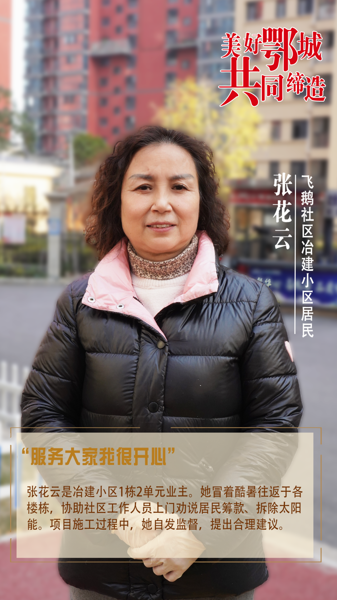 張花云是冶建小區(qū)1棟2單元業(yè)主。她冒著酷暑往返于各樓棟,協(xié)助社區(qū)工作人員上門勸說居民籌款、拆除太陽能。項目施工過程中,她自發(fā)監(jiān)督,提出合理建議。