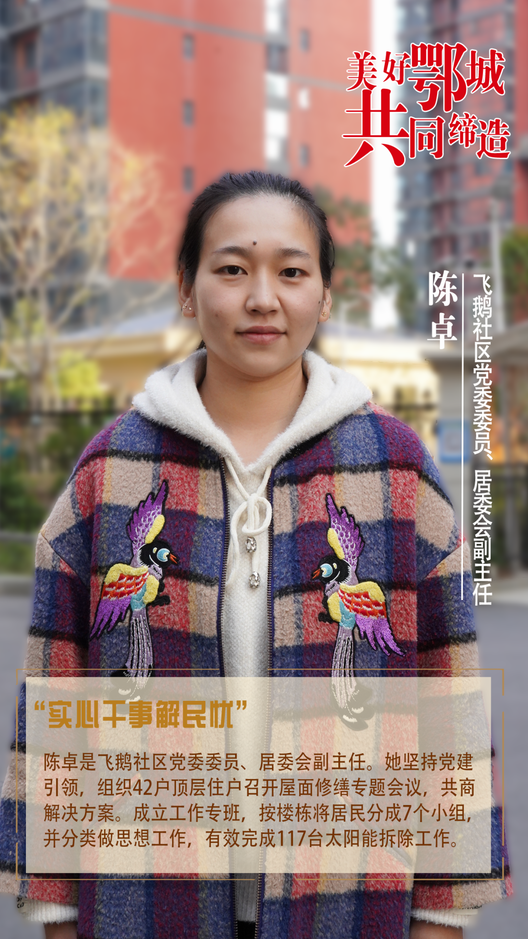 陳卓是飛鵝社區(qū)黨委委員、居委會副主任。她堅持黨建引領(lǐng),組織42戶頂層住戶召開屋面修繕專題會議,共商解決方案。成立工作專班,按樓棟將居民分成7個小組,并分類做思想工作,有效完成117臺太陽能拆除工作。