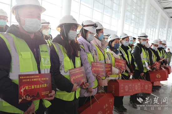 在鄂州花湖機(jī)場航站樓一樓大廳,現(xiàn)場氣氛熱烈,上午9時,鄂州市總工會為乘機(jī)返鄉(xiāng)的首批60名建設(shè)者代表贈送飛機(jī)票和年貨禮包,讓春節(jié)回家路更加溫暖、舒心、便捷。