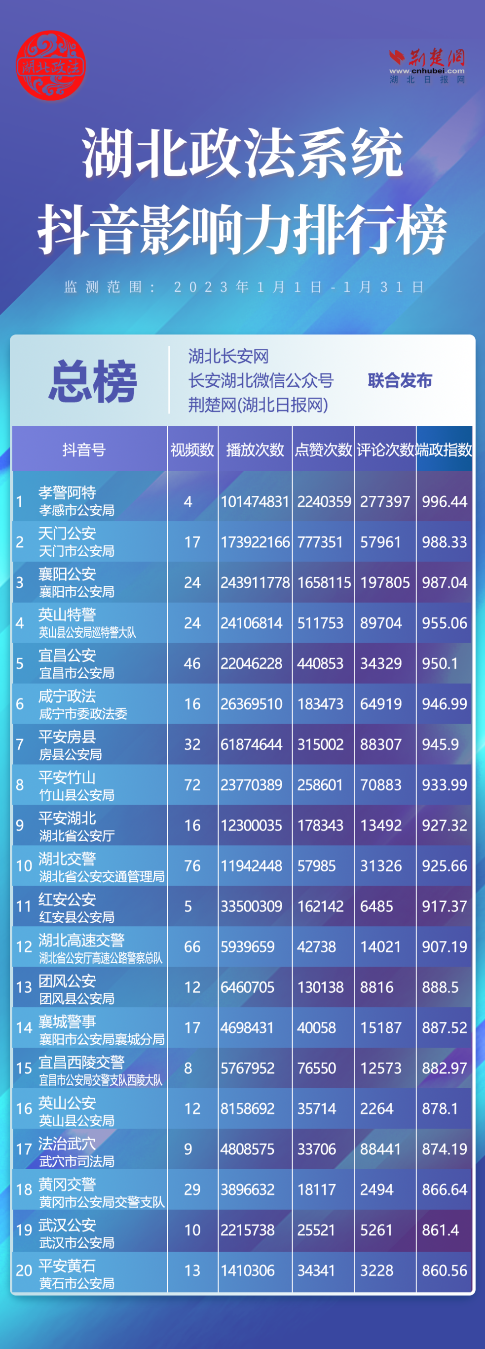 荊楚網(wǎng)(湖北日報(bào)網(wǎng))訊(記者胡小軍)2月13日,湖北省委政法委官網(wǎng)湖北長安網(wǎng)、官微長安湖北聯(lián)合荊楚網(wǎng)(湖北日報(bào)網(wǎng))、楚天輿情數(shù)據(jù)研究院發(fā)布湖北政法系統(tǒng)新媒體影響力排行1月榜單,黃岡政法系統(tǒng)多家單位入圍。