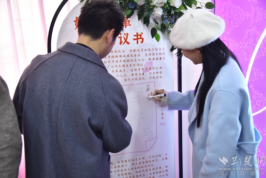 荊楚網(wǎng)(湖北日報網(wǎng))訊(通訊員 杜巧云、石姣、陳?。?/strong>“我承諾:抵制高價彩禮,為愛減負(fù),拒絕低俗婚鬧,為愛守禮,主張婚事簡辦,為愛啟航,傳承優(yōu)秀文化,為愛踐行……”2月14日上午,大冶市婚姻登記處為當(dāng)日上午登記領(lǐng)證的50對新人舉行“為愛減負(fù),我承諾、我踐行”集體頒證活動,新人們在這個特殊的日子集體宣誓并在《婚俗改革倡議書》上簽字承諾。