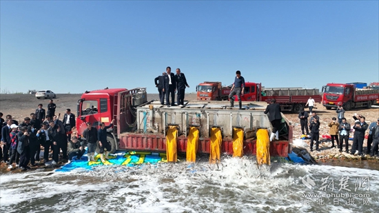 活動(dòng)現(xiàn)場,一輛輛滿載魚苗的大型貨車有序駛向江邊,工作人員爬上車,用撈魚網(wǎng)舀起魚苗認(rèn)真察看,隨后打開裝魚苗的容器,不同種類的魚苗沿著放置的斜面傾瀉,伴著晶瑩的水花,四散游向更遠(yuǎn)處。