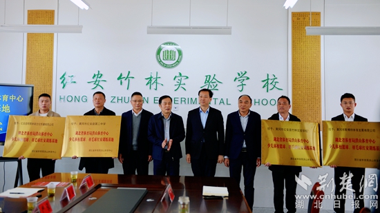 湖北省體育局洪山體育中心少兒體校與紅安縣文化和旅游局、紅安縣教育局簽訂合作協(xié)議。湖北省體育局洪山體育中心主任馮金榮分別向紅安縣第二中學(xué)、紅安縣竹林實驗學(xué)校、紅安縣明易體育文化傳播有限公司、黃岡市斯博特體育發(fā)展有限公司授予“湖北省體育局洪山體育中心少兒體育籃球、羽毛球訓(xùn)練基地”牌匾。