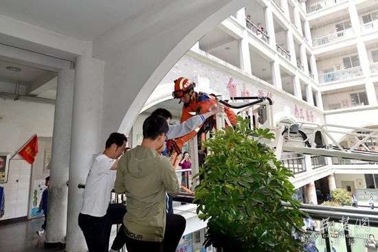 “火災(zāi)”發(fā)生后,學(xué)校立即啟動(dòng)應(yīng)急疏散預(yù)案:由老師組織學(xué)生有序疏散、安保人員進(jìn)行初期火災(zāi)撲救,同時(shí)撥打119電話(huà)報(bào)警。消防人員到場(chǎng)后迅速開(kāi)展滅火救援,并利用云梯消防車(chē)成功解救兩名行動(dòng)不便的被困高樓層的學(xué)生。
