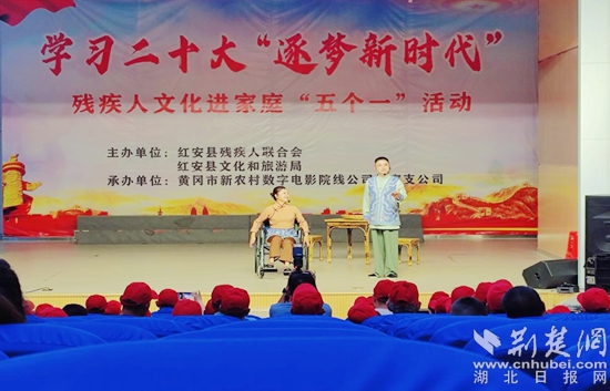 在文化館演出廳,楚劇團為殘疾人帶來了文化盛宴。大型舞蹈《花開盛世》、女聲獨唱《好人就在身邊》、楚劇小品《鹽紅》、舞蹈《床前明月光》、男聲獨唱《這一拜》、方言小品《薯你有味》、女聲獨唱《天耀中華》、大型舞蹈《請到紅安來游玩》等節(jié)目。
