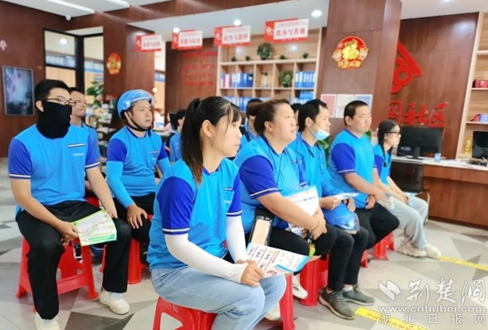 社區(qū)網(wǎng)格員為“藍(lán)騎士”們發(fā)放消防安全、預(yù)防溺水、防范詐騙等宣傳資料,動(dòng)員他們在提升自身安全防護(hù)意識(shí)的同時(shí),也通過優(yōu)質(zhì)文明的配送服務(wù)把“人人講安全 個(gè)個(gè)會(huì)應(yīng)急”的理念傳遞給更多人。