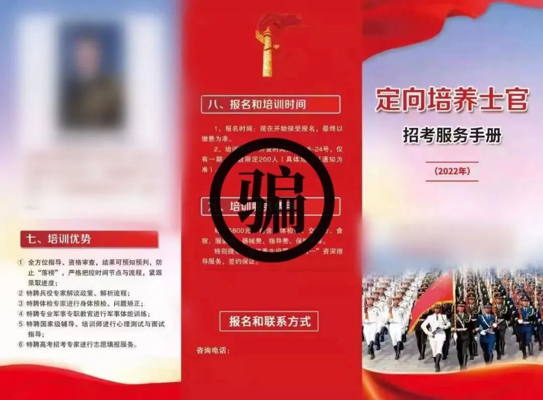 部分“培訓(xùn)機(jī)構(gòu)”甚至某些“院校”,利用考生和家長(zhǎng)對(duì)政策不了解,通過(guò)制作發(fā)放宣傳冊(cè)進(jìn)行虛假招生宣傳。這些宣傳冊(cè)封面大都與征兵宣傳冊(cè)很相似,封面上印有“參軍”“入伍”“畢業(yè)后直接成為軍士”等字樣,還融入了軍徽等軍旅元素,報(bào)考條件甚至需要提供政治考核表等,以此為噱頭索要高額學(xué)費(fèi)。