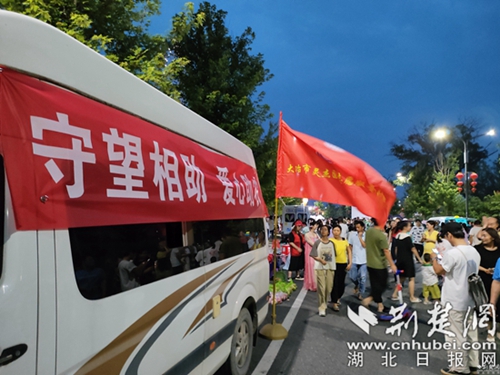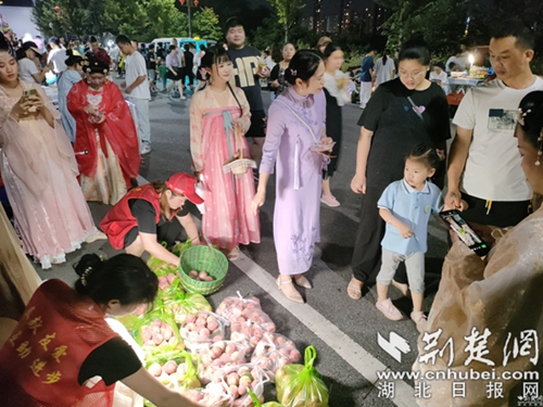 當天下午六點,大冶市靈杰國風(fēng)志愿服務(wù)隊兵分兩路,分別在恒達歡樂大世界和雨潤廣場將農(nóng)戶的桃子一袋袋的分揀好,早早地將夜市攤擺上,為了讓路人能直觀看到桃子的品質(zhì),他們將散裝桃子一個個切好給來往的行人品嘗。