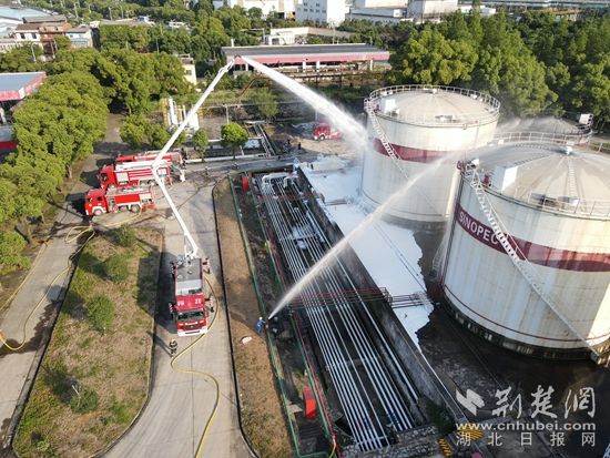 此次拉動演練設定西塞山油庫一罐體由于施工滲漏導致圍堰內(nèi)形成流淌火,情況危急。災情發(fā)生后,企業(yè)立即啟動應急預案,并撥打119報警。市消防救援支隊按照輕型化工滅火救援編隊編成,立即出動通信指揮、舉高噴射、滅火冷卻、戰(zhàn)勤保障4個作戰(zhàn)單元,總計16車50人。運用防火堤池火撲救戰(zhàn)術(shù),進行“三梯次三疊加”泡沫覆蓋,實現(xiàn)低、中、高倍數(shù)泡沫疊加覆蓋。