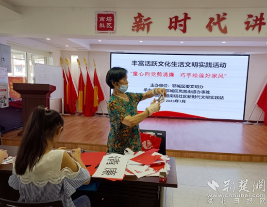 荊楚網(wǎng)(湖北日報網(wǎng))訊(通訊員 丁元中)一刀一剪揚(yáng)正氣,一毫一厘頌清風(fēng)。7月12日上午,鄂城區(qū)鳳凰街道南塔社區(qū)聯(lián)合鄂州市婦聯(lián)、鄂城區(qū)婦聯(lián)、鳳凰街道婦聯(lián)開展了“童心向黨剪清廉,巧手繪蓮好家風(fēng)”剪紙活動,將廉政素材與傳統(tǒng)剪紙相結(jié)合,用民俗藝術(shù)展現(xiàn)清廉之風(fēng)。