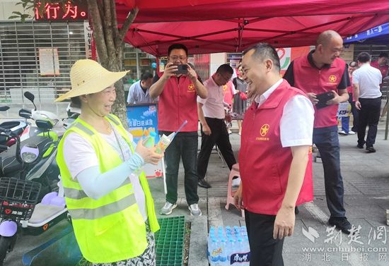 “歡迎到獻(xiàn)血車納涼歇腳,不獻(xiàn)血也可以免費(fèi)飲用礦泉水?!被顒?dòng)當(dāng)天,見一名環(huán)衛(wèi)工人在獻(xiàn)血車旁駐足觀望,身穿志愿服務(wù)馬甲的紅安縣衛(wèi)健局副局長(zhǎng)蔡霖快步上前,遞上水和果汁。