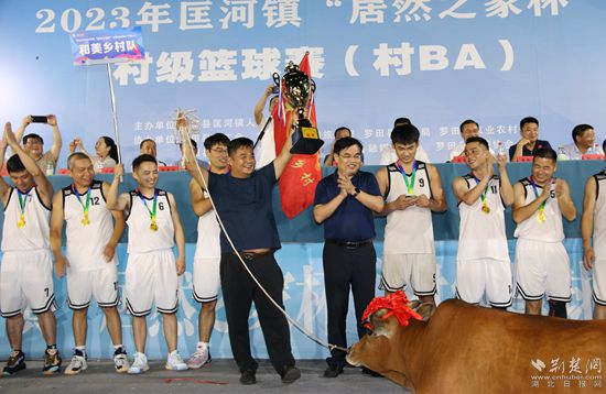 當(dāng)晚7點,隨著哨聲響起,和美鄉(xiāng)村隊與豹龍隊展開激烈角逐。雙方隊伍配合默契,帶球、傳球、上籃一氣呵成,內(nèi)線強打、后仰跳投、三分遠投精彩不斷,贏得了場內(nèi)外觀眾的陣陣歡呼。隨著終場哨響,比分定格在84:59,和美鄉(xiāng)村隊最終奪得匡河鎮(zhèn)“居然之家杯”村級籃球賽男子組的冠軍,成功牽走“冠軍?!?。