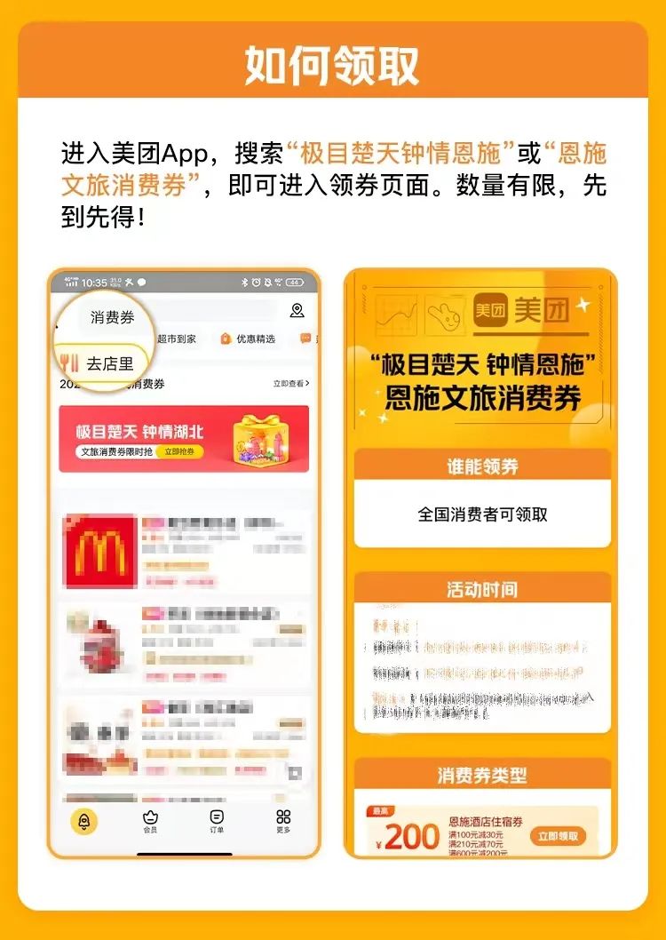 在美團和大眾點評App搜索“恩施文旅消費券”“恩施消費券”等關鍵詞,進入活動頁面領券。已領取的消費券可在“美團App-我的-紅包卡券-券包”或“大眾點評App-我的-錢包-現(xiàn)金券”內(nèi)查看,活動期間,消費券數(shù)量有限,領完即止。