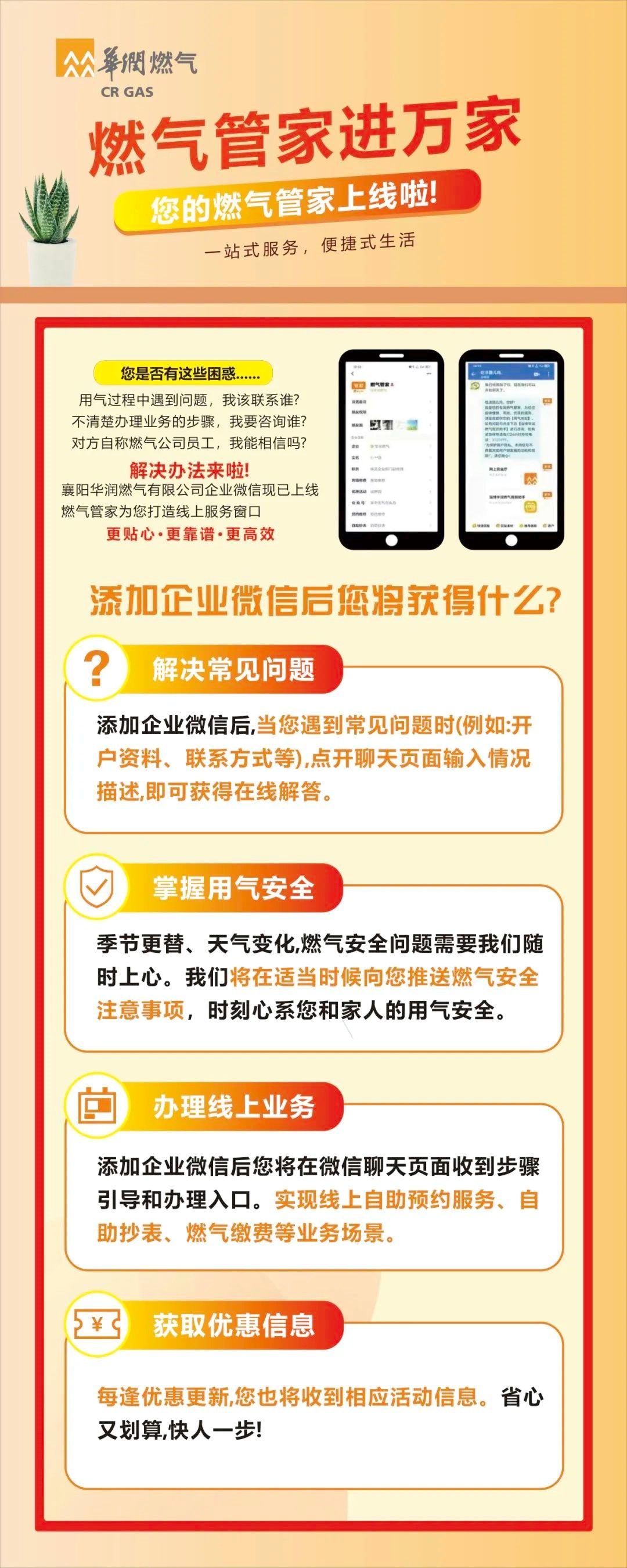 荊楚網(wǎng)(湖北日報網(wǎng))訊(通訊員 王秋琴)近2年燃氣事故頻發(fā),敲響了燃氣安全的沉重警鐘。為遏制燃氣事故多發(fā)頻發(fā)勢頭,國家發(fā)展改革委,住房和城鄉(xiāng)建設部等多個部門發(fā)布了《城鎮(zhèn)燃氣安全提升計劃》,大力推進燃氣安全智能化建設,保障居民用氣安全。近日,紅安華潤燃氣推出企業(yè)微信,打造一對一燃氣管家專屬服務。