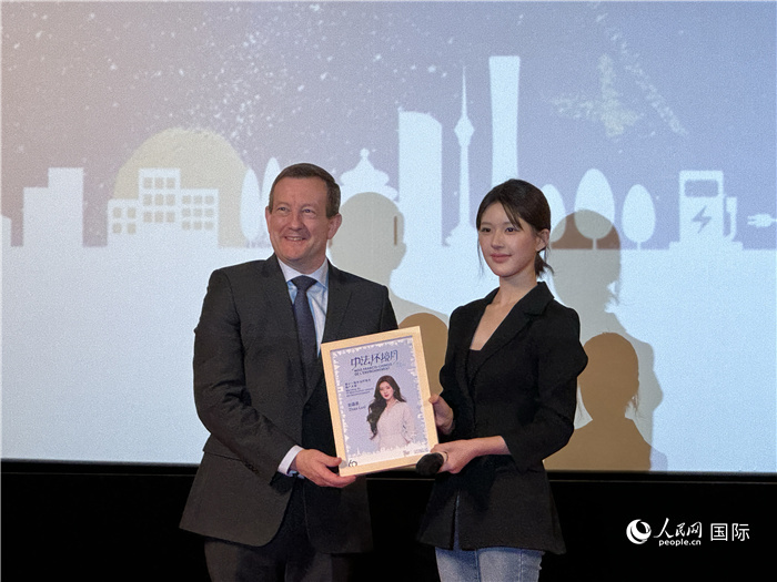 10月10日,法國(guó)駐華大使白玉堂(左)為中國(guó)演員趙露思(右)頒發(fā)“第十一屆中法環(huán)境月推廣大使”稱號(hào)。人民網(wǎng) 謝瑩攝