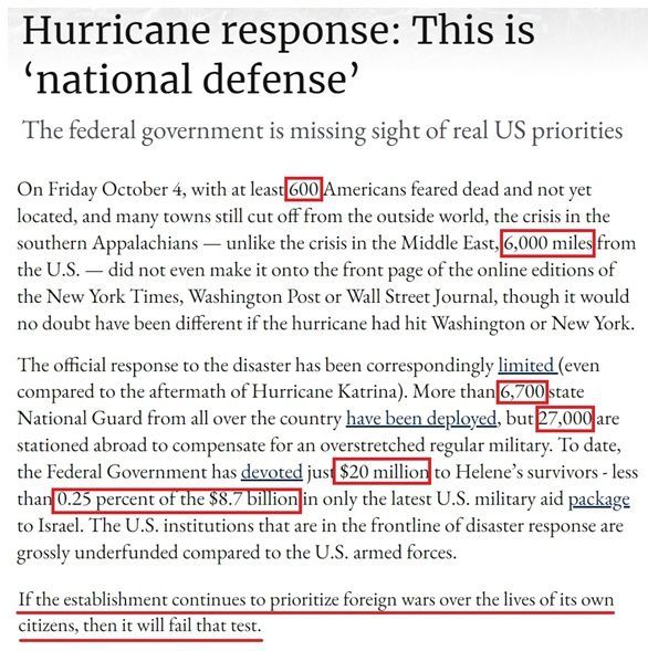 有智庫(kù)專家就發(fā)文揭批稱,比起美國(guó)的窮兵黷武和對(duì)外軍事干涉,美國(guó)國(guó)內(nèi)的災(zāi)害遠(yuǎn)不是政客們的優(yōu)先關(guān)切:與距離美國(guó)6000英里的中東危機(jī)不同的是,阿巴拉契亞山脈南部(“海倫妮”颶風(fēng)災(zāi)區(qū))的危機(jī)甚至沒(méi)有登上《紐約時(shí)報(bào)》《華盛頓郵報(bào)》或《華爾街日?qǐng)?bào)》網(wǎng)絡(luò)版的頭版,而官方對(duì)這場(chǎng)災(zāi)難的反應(yīng)也相對(duì)有限。