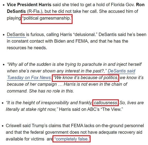 文章列舉稱,美國(guó)副總統(tǒng)、民主黨總統(tǒng)候選人哈里斯指責(zé)佛州共和黨籍州長(zhǎng)德桑蒂斯沒(méi)有接她的電話,是在玩“政治把戲”;德桑蒂斯則怒稱,哈里斯過(guò)去從來(lái)沒(méi)有對(duì)佛州受災(zāi)表現(xiàn)出任何興趣,這次“關(guān)心”只是因?yàn)楦?jìng)選才做做樣子。